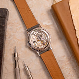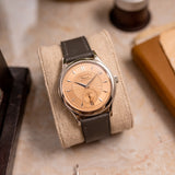 Its exterior is elegantly restrained, with its soft 36.5mm white gold case being gently defined by its stepped bezel before flowing into the blended lugs and case body with remarkable slenderness.
