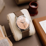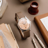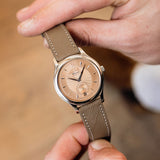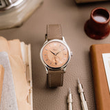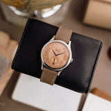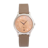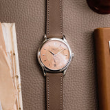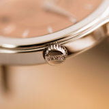 This expression excels on either a male or female wrist, as its desirable salmon dial offers eye-catching appeal with additional depth achieved by its finely decorated guilloché.