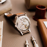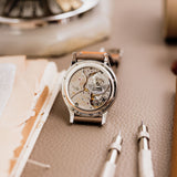 Its 36.5mm case hides its heft behind a white metal facade, as a gently defined stepped bezel flows into the blended lugs and case body with remarkable slenderness. While its platinum weight is significant, the case design is juxtaposed perfectly, with a restrained appearance allowing the clean lines and sharpness of the LUC 1860's dial to command the conversation. Precise details are the name of the game for the dial design and execution, resulting in an underdog level of lust when compared to similar dress watches of the era from more legacy watch manufacturers.