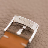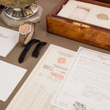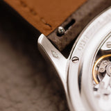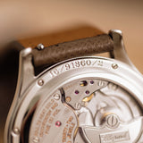 This Chopard LUC 1860 Platinum 16/91860/2 dates from 1998 and is presented today as a complete set. It includes its original warranty, bulletin, platinum pin buckle, solid caseback, wooden box, and manual. The watch is sold with its original strap and is fitted to a Mr Watchley Saffiano taupe strap.