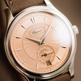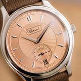Chopard re-released the watch with a salmon dial and a steel case in 2023. While the original 90s salmon dials were typically fitted in white gold cases, very rare instances of platinum cases can be found. It is believed that no more than 20 pieces were produced in platinum, let alone with a salmon dial.