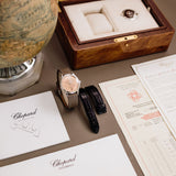 The LUC manufacture calibre 1.96 is the beating heart of this Chopard and, much like the watch it powers, has its own celebrated reputation, with Michel Parmigiani designing the movement in conjunction with Chopard over three years. The movement is awash with black polishing from its swan neck regulator to each screw head. The anglage on each bridge, alongside the engraved and signed platinum micro-rotor, shines effortlessly. The bridges feature Côtes de Genève striping and house the Geneva hallmark, identifying it as a Geneva Sealed piece. It's not just a gorgeous movement to view through the display caseback; it's also technologically impressive.