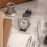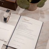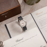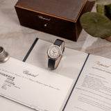 This discontinued and rare white gold Chopard L.U.C. 1860, homage to Louis-Ulysse Chopard is in very good condition. This Chopard comes with the Chopard extract and Chopard service papers. The watch is fitted with a Mr Watchley Saffiano Navy Blue strap.