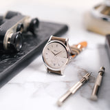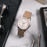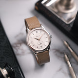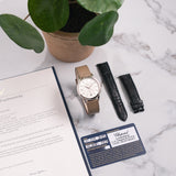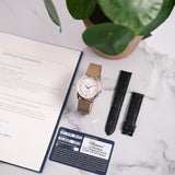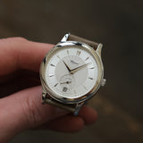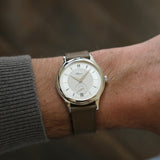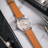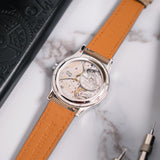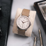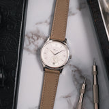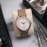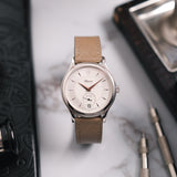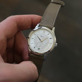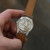 This discontinued and rare white gold Chopard L.U.C. 1860, homage to Louis-Ulysse Chopard is in fully serviced condition. The case back is signed with "Douce France - Bal de la Mer 2000", in homage to the evening organised by the Yacht Club of Monaco. This Chopard comes with the Chopard extract, service papers and the original leather strap and buckle. The watch is fitted with a Mr Watchley Saffiano Speckled Khaki strap.