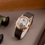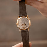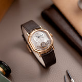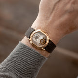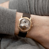 Carrying the compact coherent proportions of a rounded case, matched with the pure elegance of rectangular and oval cases, the C187 Tourbillon is a charming wearer on the wrist, suitable for formal cuffs and casual alike. Measuring 38mm in length by 35mm in width, the piece is wonderfully sized for a timepiece carrying this case shape and represents a mid-size. On the wrist, the refinement of its detailing is unmistakable. Be it the guilloché dial, brushed chapter ring, thermally blued hands, tourbillon cage, or its highly distinctive volutes en taille douce engraving, there are so many elements to consider that all play with light and shadow.