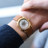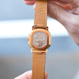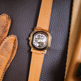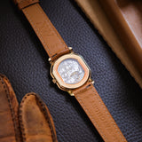 The perpetual calendars, tourbillons, and chronograph references typically enjoy the lion's share of attention and conversation around Daniel Roth watches, but there's a solid case that the purest form by the brand harbour equal amounts of appeal. Case in point, this Extra Plat, reference 2167. Dating from the early 1990s, this early piece is an honest, unadulterated expression of the man behind the brand and his personal achievements during his career rather than an exclusive embodiment of the complexities his namesake brand crafted. Featuring a manual wind calibre visible through a display caseback, this exact configuration is extremely rare. The hallmark of a Daniel Roth creation is its double ellipse 'Ellipsocurvex' case. Here, it's realised in 18-carat yellow gold and distinguished by a stepped rounded bezel, straight, sharp lugs, and an overall tonneau-esque shape. With a high polish finish throughout and its svelte profile, the consolidated and tasteful exterior is paired with a dial configuration and execution exhibiting bountiful character.