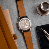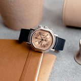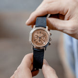 This Daniel Roth Chronograph reference S247 is in mint condition, with only minor signs of wear on the case. It will be delivered with its original Daniel Roth folding buckle and fitted with a Mr Watchley Grained Navy Blue strap from the Mr Watchley collection.