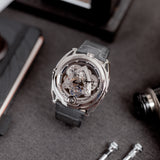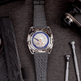 The harmonious relationship and total synergy between dial and movement with the DB28 are unparalleled. It arguably is strengthened even further here due to the piece's matching colour scheme throughout. The perimeter of this Steel Wheels features a grey ratcheted chapter ring complete with small spherical hour markers produced in titanium. In a similar vein, at six o'clock, the moon is presented in grey with two different shades, contributing to the depth and overall uniqueness. The top of the movement plate, or what one could consider the conventional dial, is high polished titanium with a darker grey outer ring. Returning to the theme of lightness is its set of hour and minute hands. Both hands are particularly distinguishable from each other—the translucent sapphire hour hand, alongside the primarily solid minute hand featuring a unique, space-age design.