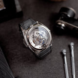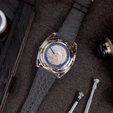 This unique execution of the De Bethune DB28 Steel Wheels was created in October 2020. Its muted, monochromatically focused depiction of the Steel Wheels measures 42.6mm in diameter and is presented in titanium. The piece has a high polish finish to its drum-shaped case and comes with its unmissable hollow articulating spring-loaded lug design and its 12 o'clock crown. Not only do these features and how they're executed give the watch its incomparable appearance, but they're also all in the name of comfort and wearability—however, it's with this DB28's dial that the uniqueness of the piece is most apparent.
