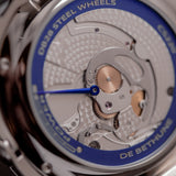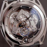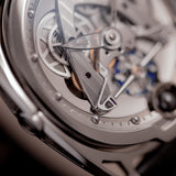 Powering this piece unique DB28 Steel Wheels is the Caliber 2115V4 by De Bethune. Displaying the hours, minutes, and a power reserve indicator viewed through the display caseback, this movement is best characterised by its dial side features, most notably the delta-shaped bridge complete with a "Côtes De Bethune" decoration. This proprietary take on Côtes de Genève striping is accomplished using a microlight micrometric technique developed by De Bethune. This skeletonised bridge is central to the whole watch and plays a pivotal role in further instilling the futuristic charisma of the piece. Furthermore, thanks to said skeletonisation, the twin barrels of the movement can be viewed, which also carry an open-work configuration. This superb movement can achieve six days of autonomy and represents the highest hand-finished quality.