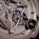 The most apparent hint of colour comes from the balance wheel of this De Bethune, situated towards the lower portion of the dial. Finished in blued titanium with white gold masses periodically throughout, the spiderweb set balance is flanked by shock springs doubling as a balance bridge known as the "Triple Pare-Chute" system by De Bethune.