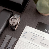 The De Bethune DB28 Steel Wheels Piece Unique is presented in very good condition. The watch is sold as a complete full set including its original box, papers, De Bethune straps, as well as a letter from the CEO of De Bethune confirming its provenance and unique completion.