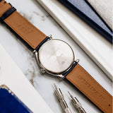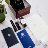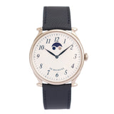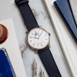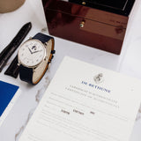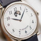 This De Bethune DB9W dates from 2006 and is presented in excellent condition. The watch is complete as a full set with its box, papers, manual, white gold DB pin buckle and original black alligator De Bethune strap. It is fitted to a Mr Watchley Grained Navy Blue Leather.