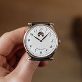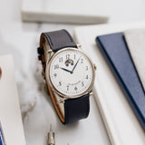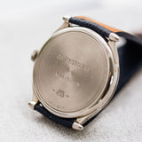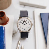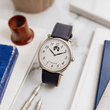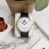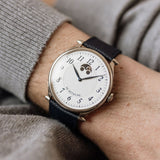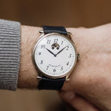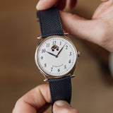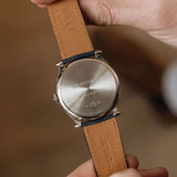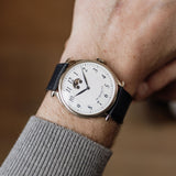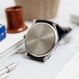 Due to the manual wind movement and its solid caseback, having an indicator is incredibly helpful when wearing this piece, even more so when we consider the calibre can run for seven days. Once fully wound, the disk will move and sit in the right-hand round aperture, and once depleted, it'll have moved into the left.