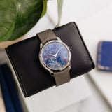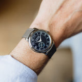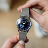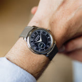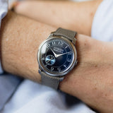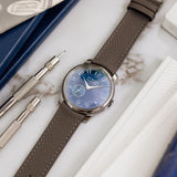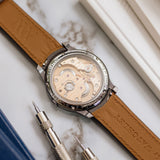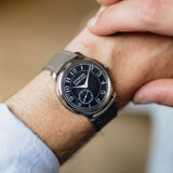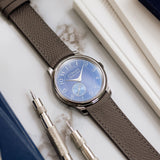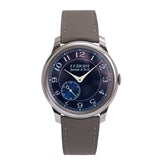 If there's only one takeaway from the Chronomètre Bleu, it's that there's nothing regular about an F.P. Journe, as even their entry watch innovates – take its tantalum case. This metal is perfect for watch cases as it is corrosion / wear-resistant and non-allergenic, making for an easy choice when creating a watch. But it's not all sunshine and rainbows, as this dark grey/blue-coloured metal is notoriously challenging to mine and work with. It is a rarer metal than gold and, therefore, is seldom used in watchmaking. These challenges didn't deter F.P. Journe, giving this unique exterior an entirely polished finish. The case carries a domed bezel with a symmetrical caseback and bezel flange that defines the mid-case profile of this elegant piece. The lugs blend flawlessly with that mid-case and downturn perfectly for wearability, aided by a 39mm width, a middle-ground size rarely offered by the watchmaker.