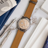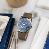 The case is intriguing, but we're all here for the dial. Produced from multiple layers of hand-polished blue lacquer, it's nothing short of mesmerising. The dial comprises seven layers, each having to be dried before the next layer can be added, eventually giving the watch its mirrored dial effect once viewed at an angle. Although unconfirmed, it's understood that the fail rate for these dials during production was between 60% - 80%, such as the complexity of its execution. Nevertheless, the trade-off is worth it, as the dial is remarkably unique, shifting from vibrant chrome blue to slate grey and glossy black. This effect is best accentuated when related to its white printed Arabic numerals that cast a unique multi-shadow on the endless dial below. Yet the piece de la résistance is its sub-register, as, regardless of the dial's fragility, it carries a concentric circle guilloché that resolutely maintains its vibrant blue tone. The sub-register has a second railroad track and a pomme counterbalanced hand. Sitting below the bold 'F.P. Journe—Invenit et Fecit' signature are the hour and minute hands in white and classic Journe teardrop style form.