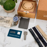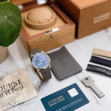 This Chronomètre Bleu is in excellent condition and offered as a full set. Dating from 2018, the watch is sold with its original outer box, inner box, warranty card, Journe cleaning cloth, original Journe strap and pin buckle. The set comes with 3 custom Mr WATCHLEY straps as well. A grained midnight blue, a grained mid grey and a grained cream.