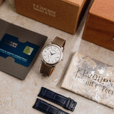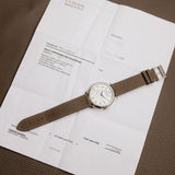 Dating from 2022, this F.P. Journe Chronomètre Souverain in Platinum is presented as a full set and is complete with its outer box, inner box, original sales invoice, warranty card, original F.P. Journe strap, a grained taupe custom strap, platinum pin buckle, and cloth. The piece is in great condition, with some hairline picked up from wear.