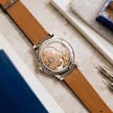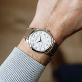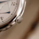 There's nothing regular about an F.P. Journe, even with their most conventional and classic model like this Chronomètre Souverain. Rendered in platinum, the case carries a domed bezel with a symmetrical caseback and bezel flange that defines the mid-case profile of this elegant piece. The lugs blend flawlessly with that mid-case and downturn perfectly for wearability. The entire exterior of the watch is entirely polished, with only the double-dimpled knurled crown breaking up the smooth visuals. Its significant weight comes not only from its use of platinum but also because of its 40mm width, a size balanced by a thickness of just 8mm.