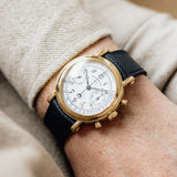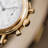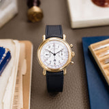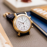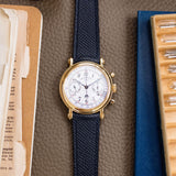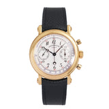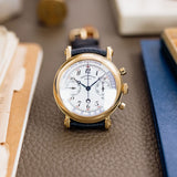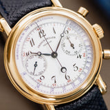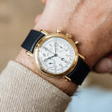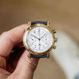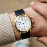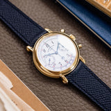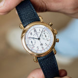 Examples of early Franck Muller creations, such as this, reveal that the brand started off producing very classically designed dials, and this 1750VEM may just be one of the pinnacles. Firstly, it carries a crisp white enamel dial, It gives the watch a unique lustre in person, which is complemented by dial details that, the longer you look, the better they get. Firstly, Breguet-style heat-blued hour and minute hands dominate the dial, with a large counter-balanced pomme chronograph hand and two needle-style hands for the bi-compax chronograph registers. The dial carries black, red, and blue colours throughout, with a blue pulsation scale, initially used for measuring heart rates, sitting around the dial's periphery. Large Breguet-style Arabic numerals sit within the railroad track, which is accompanied by red five-minute numerals. At the same time, the same execution can be seen within the sub-registers, except in all black.