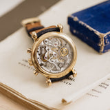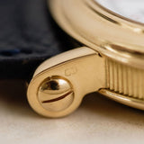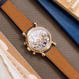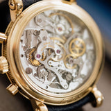 With only a handful 1750VEM known to the market and dating from 1993, this piece is believed to have been produced in minimal quantities from 1993 until 1996, with less than 30 examples assembled. Measuring 37.5mm and cased in 18ct yellow gold, the 1750VEM is beautifully mid-sized, with a convex rounded bezel and straightforward pump pushers elaborate the significant scroll-like screw lugs. The gold exterior of this piece marries the two sides of early Franck Muller, hugely expressive yet with bespoke classic touches, with a coin-edge mid-case emulating a design touch often seen on Breguet's.