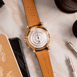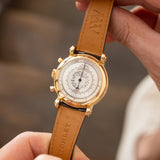 While the front of the watch is a clean, elegant dress affair, the back conveys Muller's uncompromising and purpose-considered approach to watchmaking. Dedicated to scales and accurate functionality, the back of the watch reveals a silver snail dial with a tachymeter, telemeter and pulsometer. Both black and red typefaces occupy this details-orientated dial along with a concentric circle guilloché, two thin bands of gold, and yet another heat-blued hand, precisely matching the front-sided chronograph hand.