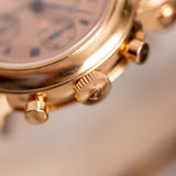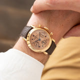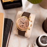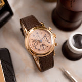 It's more than likely that your relationship with Franck Muller differs from the next person. The Casablanca, the Crazy Hours, the Master Banker, or possibly even the early 'Tasti Tondi' Chronographs, there are numerous stylised ways to connect with this innovating brand. Yet one of the most intriguing is the Double Face Chronograph, a bewitching realisation of the chronograph made all the more mesmerising by this possibly unique pink-on-pink configuration. Standing as the only one known to the market, this Double Face Chronograph reference 7000 DF is a notable example of an icon from Franck Muller's creative mind. From its convex rounded bezel and straightforward pump pushers to its elaborately significant scroll-like screw lugs, the 18k pink gold exterior of this 39mm piece marries the two sides of early Franck Muller, hugely expressive yet with bespoke classic touches.