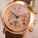 This possibly unique Franck Muller Double Face Chronograph 7000 DF is presented in good condition, only showing hairline scratches. The watch is offered with its original box as well as its Franck Muller strap and original pink gold pin buckle. The watch is fitted on a Mr Watchley Brown Madras leather strap.