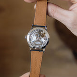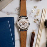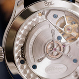 Powering the Erwin Star is the manually wound A11S Calibre. Rather than the familiar sweep typically associated with mechanical movement, this redesigned Valjoux 7750 calibre has a deadbeat second (or jumping seconds) module that ticks once for every second. In true Habring² style, this complex complication has been re-imagined with the 7750's form being upgraded and modified. The movement has a power reserve of 48 hours and is finished to a classic yet elegant standard, with anglage, circular brushing, and perlage all visible via its display case back.