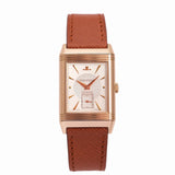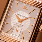 The rose gold of the case frames a brushed silver dial. This delicate combination of colour is given a certain edge by the rose gold applied dagger indexes and rose gold dauphine hands. The stark angular aspects of Art Deco are brought to the fore. Throughout the dial there is a play on the angle and the curve, just as there is with the Reverso case: rectangular in form yet with gently curved triangular lugs and softly vaulted curved sides. In contrast to the angular indexes and hands, the centre of the dial is covered in rich, flowing rosette guilloché, while écaille de poisson guilloché fills the rectangular small seconds subdial at 6. An etched minute-track frames the dial, while the rest of the silver dial has been given a vertical satin finish. The dial is signed, a slightly raised cartouche with 'Jaeger-LeCoultre' sits just above the centre of the hands and another with 'Reverso' sits just below, while a rose gold applied Jaeger-LeCoultre logo marks the 12. 'Swiss' and 'made', printed in black, sit either side of the small seconds.