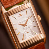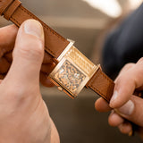 With its Grand Taille dimensions and the distinct form of the Reverso case, the presence on the wrist is (quite) bold. Yet with the soft colour of the dial and the unadulterated thrill of the movement, there is an overall lightness to the piece that makes it a particularly unique dress watch - and one that is sure to attract an array of fascination and attention.