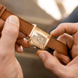 The dial is a balance between soft elegance and sharp style, while its silver colour serves as the perfect lead into the stunning pink gold labyrinth that is found on the reverse side of the watch.