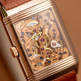 The first ever Reverso with an engraved, skeletonised movement, the movement recalls the incredible metalwork that emerged during the Art Deco era. Closely-knit, intricate and varied texture, colour and bursting with adornment - it left no space empty or unattended to. Edgar Brandt's Oasis from 1925 is the perfect example. This beautifully crafted calibre from Jaeger-LeCoultre captures that spirit entirely. Rose-gold plated, free-hand engraved bridges swirl over the movement's visible and intricate mechanics which are fashioned from brass and steel, while fired blue screws and purple rubies interject with their vibrant colour. A spectacle of artistry.