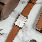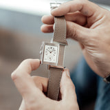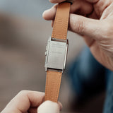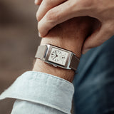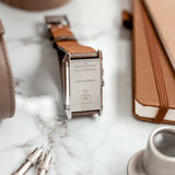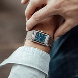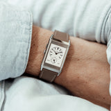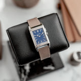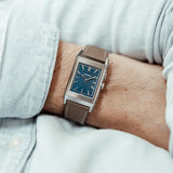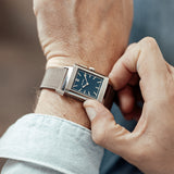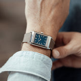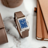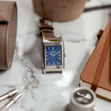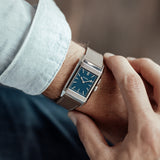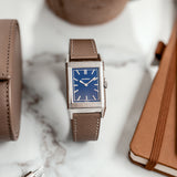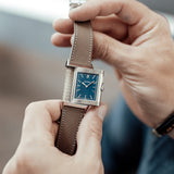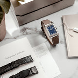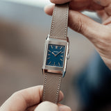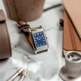 Characterized by its slender 9 mm thick case and traditional polished gadroons framing the rectangular dial, the watch stands out with its glossy blue lacquer face. The seemingly simplicity of the dial, following its vintage design ethos of ‘less is more’, is further enhanced by applied rhodium-plated, mirror polished, struck hour-markers and sword-shaped hands.