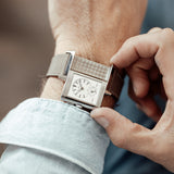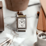 The steel case measures up to the size of the Reverso 1931, being bold on the wrist despite its slenderness with dimensions of 46.8 mm by 27.4mm. The ‘REVERSO’ signature, printed at 12, is a reproduction of the early logo as depicted on the vintage model. It has also been inscripted on the brushed case back, below the manufacture’s signature and above the inscription of ‘Special Edition’.