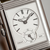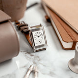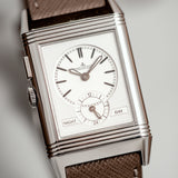 The watch is in mint condition and has perfect mechanical functionality. It comes with the original warranty papers, manual, tag, leaflets, inner and outer boxes. The original black Fagliano strap is included (worn) and a new original black alligator leather strap (unworn) with JLC-stamped tang buckle is included as well. The watch is fitted with a Mr Watchley Saffiano Taupe strap (as seen on the pictures).