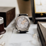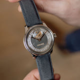Powering the Kudoke 2 "Zodiac" is the Kaliber 1. Developed with the assistance of fellow independent watchmaker Habring², the movement features an entirely custom finish and represents the first time hand engraving can be found throughout the movement of a Kudoke. Once again, Yuen Rapati's skills were utilised to design the motif throughout the 3/4 bridge.