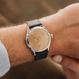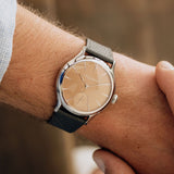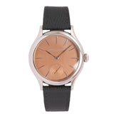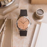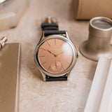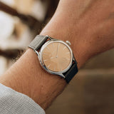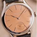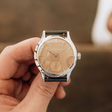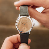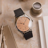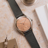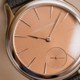 But the start of the show for many is that dial; all it takes is four elements to create this classical beauty. At the centre of this Laurent Ferrier is the autumnal-inspired dial, a salmon-like tone which you won't find as commonly as silver or black, but its expression is surprisingly suitable. Though the pairing with the vertical satin-brushed finish here allows this dial's dynamism to come alive, especially when accented with a radial guilloché for the subsidiary seconds register at six. Although stainless steel forms the piece's exterior, white gold sits underneath the crystal, with Ferrier's signature drop-shaped hour markers and the Assegai-shaped handset supplying a style reminiscent of traditional watchmaking. The final element of note is, in fact, the silver printing for the Laurent Ferrier Geneve signature at twelve, as well as the dot marker minute track around the periphery of the dial. Once again, it's a piece that tastefully conjures up design cues from yesteryear and respectfully hints at Ferrier's career at Patek Philippe.