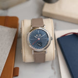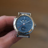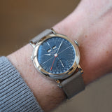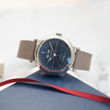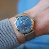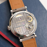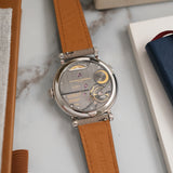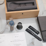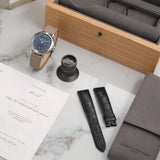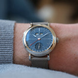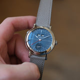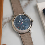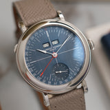 Dating from 2024, this Laurent Ferrier École Annual Bleu is offered as a full set in like new condition. The watch is fitted to a Mr Watchley Mid Grey Grained leather strap.