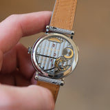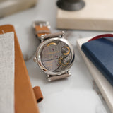 Neatly integrated into the back of this movement is a power reserve indicator, a valuable complication for manual wind pieces, all while being decorated with Côtes de Genève striping, a ruthenium treatment throughout the bridges and perlage of the mainplate.