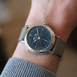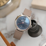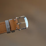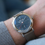 This basinné 40mm stainless steel case prides itself on smooth, seamless surfaces and beautifully soft lines. The sans sharp angles connect closely to the early stages of wristwatches, with a profile perspective highlighting the case body's pocket watch origins. The pastille lugs speak to the conversions of watches from the pocket to the wrist during the early 20th century, with a period-correct form and flair. These lugs attach directly to the three-piece polished case. Compared to Ferrier's School Piece, the low profile, elegantly rounded bezel bears an uncanny resemblance. This appetite for smooth lines is a firm favourite of Ferrier, and with a shared DNA with the Galet, it's no wonder the flowing pebble-like execution of the case is indisputable.