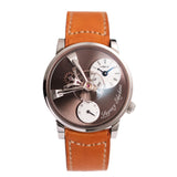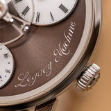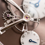 To further extend the narrative of wearable and versatile luxury outlined by the case, an equally sleek dial in the form of a rich metallic chocolate brown base sets the mood. Not as severe as black nor as traditional as silver, the warmth achieved by the brown radial sunburst tones greatly enhance this special edition's distinction. The watch is adorned with unmatched dial architecture fundamental to its function yet, in equal measure, its character. Two small traditional dials sit in the two and six o'clock positions. Both are white lacquer, slightly domed, feature blued-gold hands, and sit above the base dial as if floating. At two o'clock, the hours and minutes are presented, with a set of thin Roman numerals along with the MB&F signature. At six o'clock, a smaller power reserve indicator dial informs the wearer when the supersized balance wheel begins to run low on its power source. Securely positioned below the high domed crystal and measuring 14mm, the three-dimensional "flying" balance wheel beats at 18,000 vph and is profoundly suspended above the centre of the dial by its arching balance bridge. The escapement wheel and anchor sit beneath the commanding balance and are held by a bridge mirroring the one for the balance on a smaller and flatter scale. 'Legacy Machine' is freehand engraved at the lower right-hand portion of the dial by Kari Voutilainen as a forward-facing feature which marks the joint partnership between Kari and MB&F.