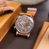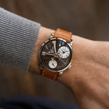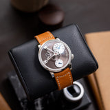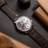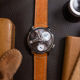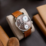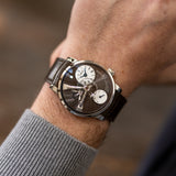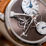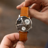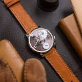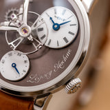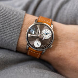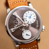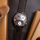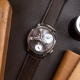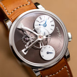 On paper, the LM101 measures 40mm in width and a substantial 16mm in height, but that thickness is more manageable in the metal. With a good chunk of its height attributed to the domed crystal and the low-case flank placement, this is an MB&F with a sensible yet wildly particular wrist presence. The balance wheel, bridges, and two dials are celebrated and accentuated further thanks to its warming chocolate brown dial. There is no confusing this piece for anything other than an MB&F, and its neutral sunburst face has an overwhelming unisex quality in abundance. HODINKEE limited editions have become a crucial part of their advancements as a brand, and as a celebration of the art of timekeeping, it doesn't get much better than this. It wouldn't be out of place to call this exceptionally exclusive stainless steel expression of independent watchmaking ahead of its time.