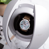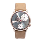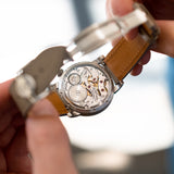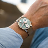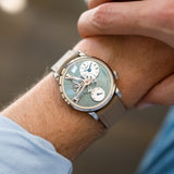 On paper, the LM101 Palladium measures 40mm in width and a substantial 16mm in height, but that thickness isn't as daunting as it may seem in the metal. With a good chunk of its height attributed to the domed crystal and the low case flank placement, this is an MB&F with a sensible yet wildly particular wrist presence. The balance wheel, bridges, and sea green canvas share the limelight with confidence. There is no confusing this piece for anything other than an MB&F, and its neutral sunburst face has unisex qualities in abundance. There are few more memorable ways to celebrate the art of timekeeping than this seldom seen LM101.