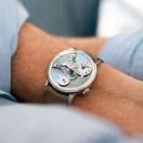 When the LM101 Palladium was announced in 2019, it was the first watch by MB&F to use this expensive material. As such, an equally gorgeous dial in the form of the calming tones of this vert d'eau face was fitted. Not totally green in colour nor totally blue, this LM101 possesses a mesmerising radial sunburst canvas which echoes the glow achieved by its unusual case material. The watch is adorned with unmatched dial architecture fundamental to its function but, in equal measure, its character. Two small traditional dials sit in the two and six o'clock positions. Both are white lacquer, slightly domed, feature blued-gold hands, and sit above the base dial as if floating. At two o'clock, the hours and minutes are presented, with a set of thin Roman numerals along with the MB&F signature. At six o'clock, a smaller power reserve indicator dial informs the wearer when the supersized balance wheel begins to run low on its power source. Securely positioned below the high domed crystal and measuring 14mm, the three-dimensional "flying" balance wheel beats at 18,000 vph and is profoundly suspended above the centre of the dial by its arching balance bridge. The escapement wheel and anchor sit beneath the commanding balance and are held by a bridge mirroring the one for the balance on a smaller and flatter scale. 'Legacy Machine' is freehand engraved at the lower right-hand portion of the dial by Kari Voutilainen and represents a forward-facing feature which marks the joint partnership between Kari and MB&F.