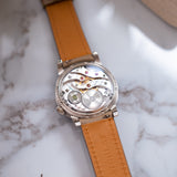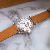 As a brand shy of basically nothing, this MB&F LM101 delivers whimsicality alongside mastering a usual metal, Palladium. The LM101 is a cherished cornerstone of the MB&F lineup, with this example of an 18-piece run underscoring just how special a Legacy Machine is. It's a timepiece that's beauty is achieved through the synergy of mechanics and sophisticated advancement, with its externals carrying a classic bold yet restrained structure. Brushed on the case's side with a contrasting polished finish for the bezel and lugs, this palladium exterior is a masterclass in balance. Palladium is a white metal from the platinum group with a unique shine. Despite being a heavier metal, it is one of the lightest in its group and is slightly more scratch resistant than platinum. Furthermore, it is one of the rarest metals and is estimated to be 15 times rarer than platinum and extremely difficult to work with.