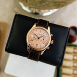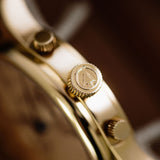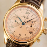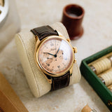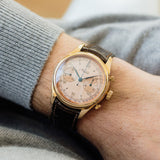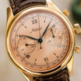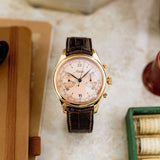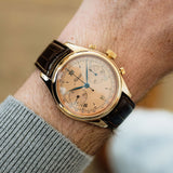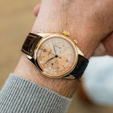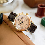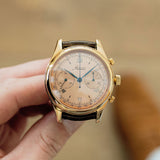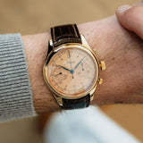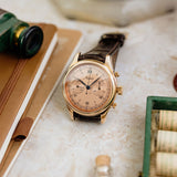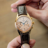 While lovely and beautifully executed, the case of this Minerva really plays host to the dial, which appears to have come straight out of the 1920s thanks to its beautiful touches of original flair. It all begins with its base colour, a subtle pink salmon consistent throughout the entire dial, creating a luxurious pairing for the yellow-gold case. The elegance of this tone is heightened by the very subtle use of blue printing for the tachymeter scale, which sits at the periphery of the dial. This philosophy of blue on pink continues, with a set of lovely leaf hands being heat blued, to match with the chronograph needle style hand and subsidiary registers. Compact yet still impactful Roman numerals sit within the tachymeter scale, their execution playing an underappreciated role in the early 20th-century feel of this design. This understanding of dial proportions lends itself perfectly to this piece's twin register configuration, which in turn results in perfect dial symmetry. Lastly, the final dose and irresistible charm is the original 'Minerva' signature, especially its cursive M that underlines the name.