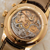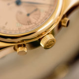 With origins back to the 19th century, Minerva's longstanding mechanical proficiency came to light during the turn of the 21st century through gems such as this Villeret Chronograph. Carrying the reference M132000, this example is a sea of tradition and early 20th-century style fused with contemporary execution, with its 40mm case being rendered in 18k yellow gold. An entirely polished affair, the case carries a stepped concave bezel, widely set commanding lugs, and two screw-down chronograph pushers with knurling flanking a signed Minerva crown.