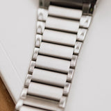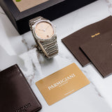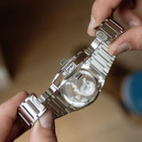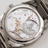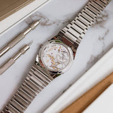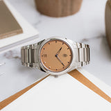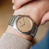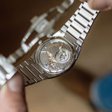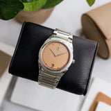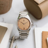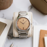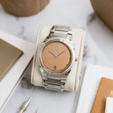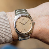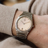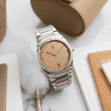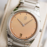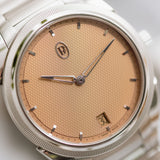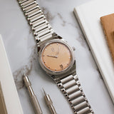 Rendered in steel, this piece features a unique pinky dial hue referred to as 'Serenissima' and was created in collaboration with the watchmaking magazine Revolution and luxury menswear publication The Rake. One of only 25 examples produced in 2022, the watch measures 40mm wide and carries brushing on its profile with a high polish on the top of its lugs. Said lugs are unassuming from the top view but, from the side, reveal beautifully executed teardrop curves accented by polished chamfers. Here is where the svelteness of the case and be fully appreciated, with its entire thickness clocking in at just 7.8mm. Just as refined as the case itself is the widely set bracelet with its seamless continuation of the case multi-finishing. This subtle element contributes significantly to the overall wrist presence, almost making the watch wear like a cuff on certain wrists. While the case is steel, the thin knurled bezel is rendered in platinum, adding both heft and visual intrigue.