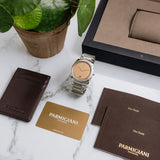 This Parmigiani Fleurier Tonda PF "Serenissima" is in very good condition with some light signs of wear on the bracelet. It comes with its inner and outer box, warranty card, and manuals.